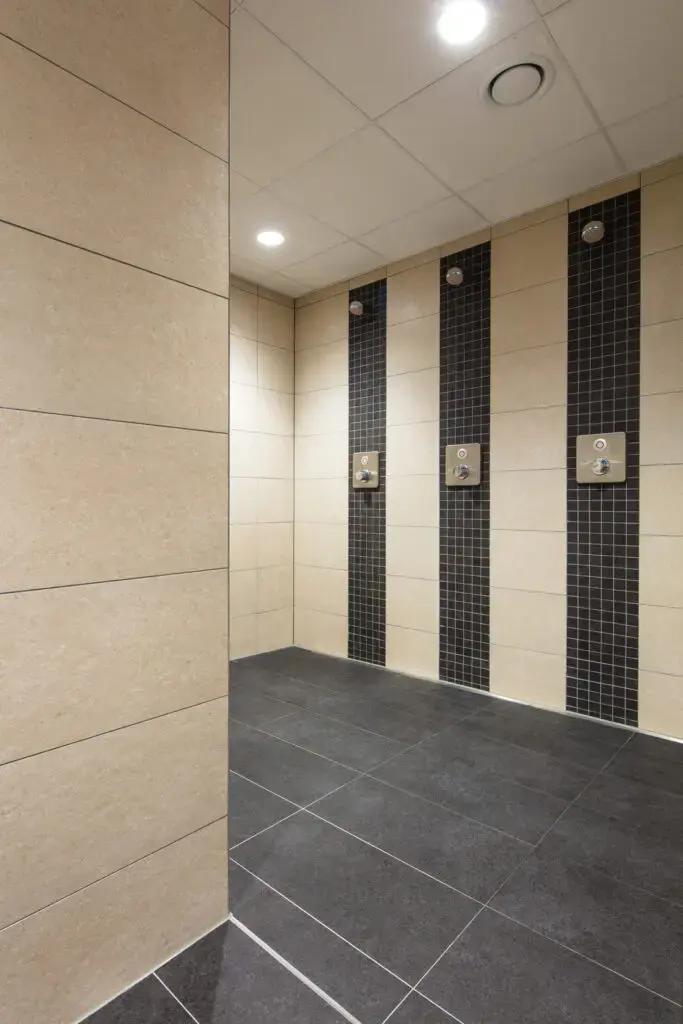 Faianța și gresia din seria RAKO® Base reproduc aspectul natural de piatră. Suprafețele sunt aranjate în contrast, există combinații de plăci bej deschis și antracit, de dimensiuni 30x60cm, iar zoana dușurilor, unde capetele de duș sunt incorporate, este scoasă în evidență de un mozaic format din pătrățele de 5×5 centimetri. Intenția arhitectului Heinz Scheunstuhl a fost să evite aspectul banal al zonei de dușuri, placând-o de la podea până sus în tavan.