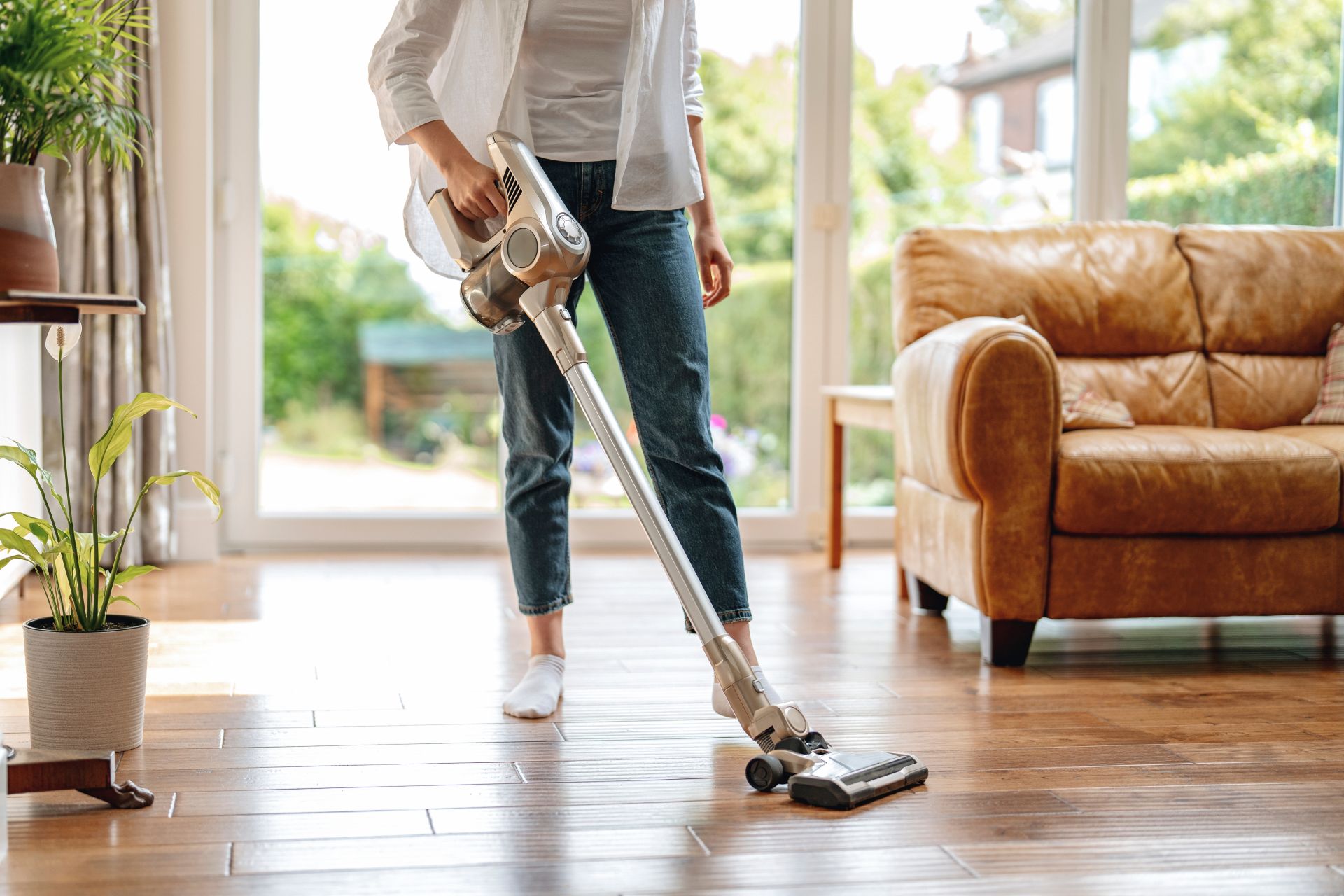 interioare moderne cu gresie aspect lemn – living cu lumină naturală și tonuri calde